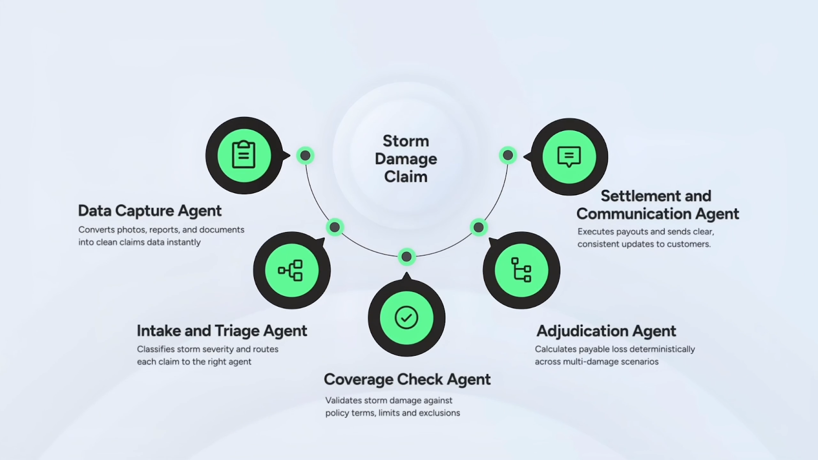 The agents did not assist a human operator. They executed the full process, handling unstructured inputs like emails, scanned documents, and photographs, running policy logic, and reaching a settlement decision autonomously.